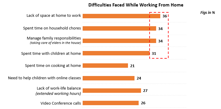 - Flexi working hours – 34% respondents need to spend time on household chores, an equal number must attend to family members, especially elders. These are prime factors driving dissatisfaction in a WFH scenario.